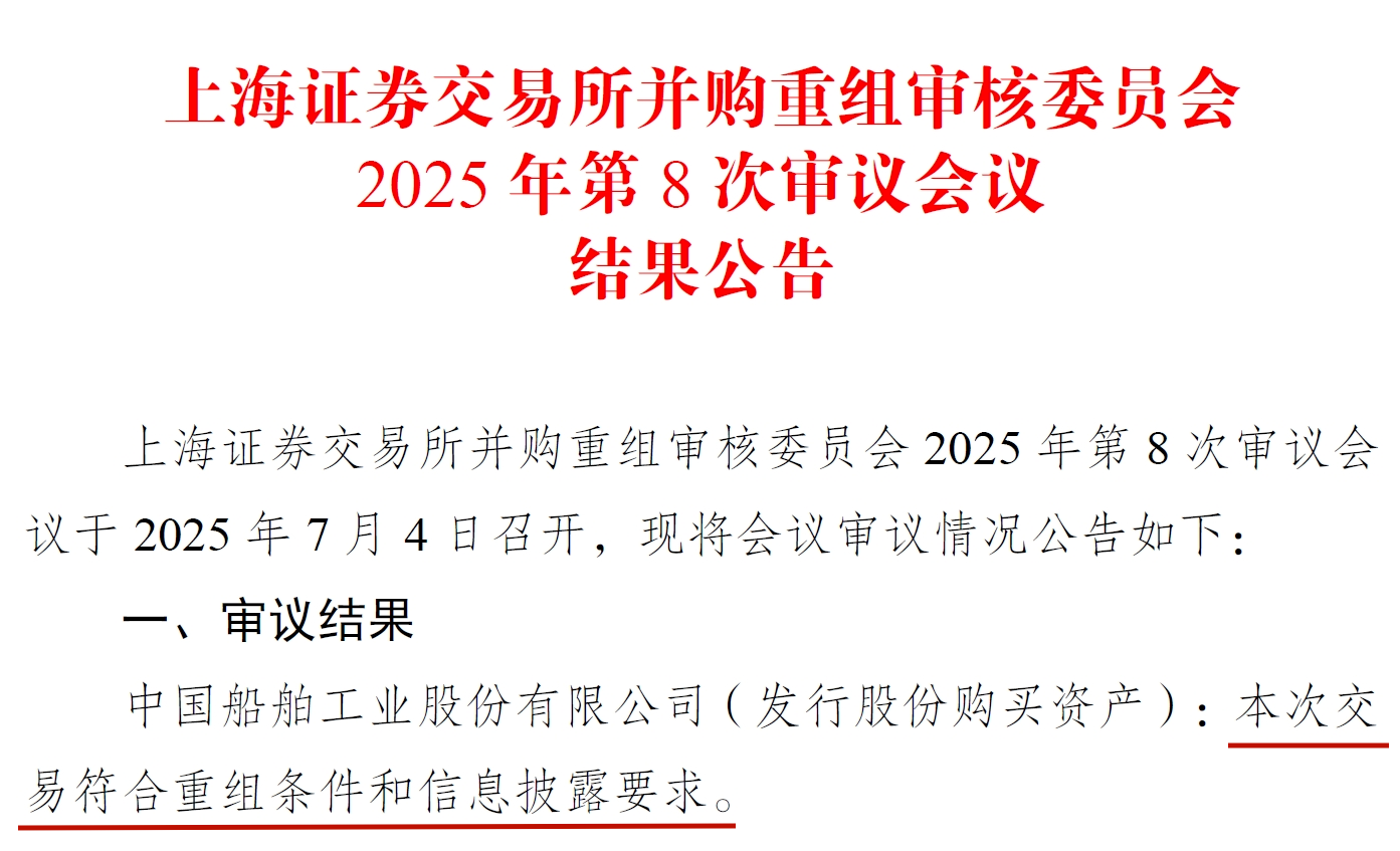 7月4日,上海證券交易所并購重組審核委員會(huì )2025年第8次審議會(huì )議召開(kāi),審議結果為中國船舶工業(yè)股份有限公司(發(fā)行股份購買(mǎi)資產(chǎn)):本次交易符合重組條件和信息披露要求。