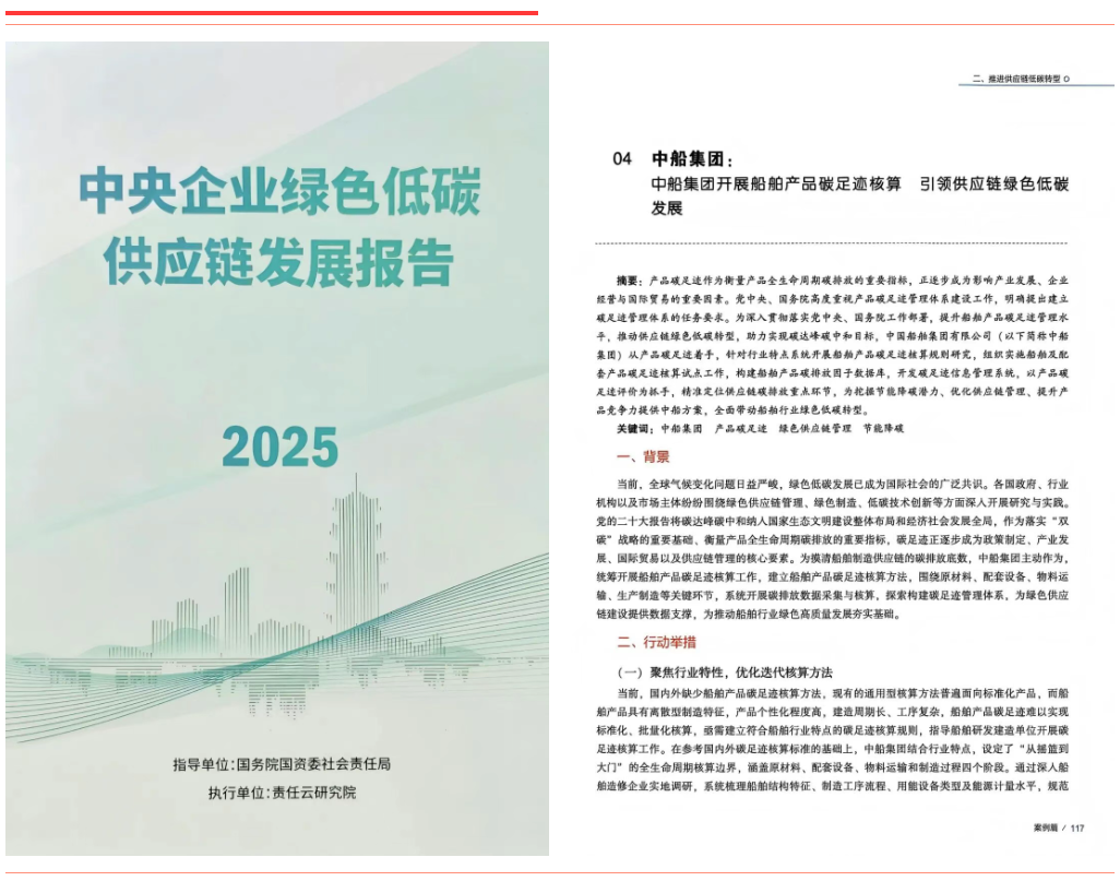 《中船集團開(kāi)展船舶產(chǎn)品碳足跡核算引領(lǐng)綠色供應鏈低碳發(fā)展》聚焦船舶產(chǎn)品全生命周期碳足跡核算,構建了行業(yè)首套核算規則與數據庫,有效帶動(dòng)供應鏈上下游協(xié)同減排。該案例入選《中央企業(yè)綠色低碳供應鏈發(fā)展報告(2025)》。