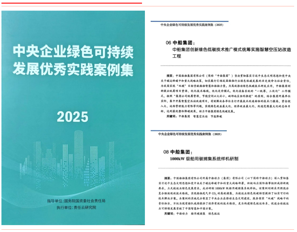《中船集團創(chuàng )新綠色低碳技術(shù)推廣模式 統籌實(shí)施智慧空壓站改造工程》通過(guò)系統推進(jìn)智慧空壓站改造,創(chuàng )新“一統籌、三優(yōu)化”模式,大幅提升設備能效?!吨写瑒?dòng)力1000kW級船用碳捕集系統樣機研制》圍繞船用碳捕集關(guān)鍵技術(shù)開(kāi)展攻關(guān),采用燃燒后復合胺吸收工藝,實(shí)現CO?捕集率超85%、純度達99.9%。上述兩項案例入選《中央企業(yè)綠色可持續發(fā)展優(yōu)秀實(shí)踐案例集(2025)》。