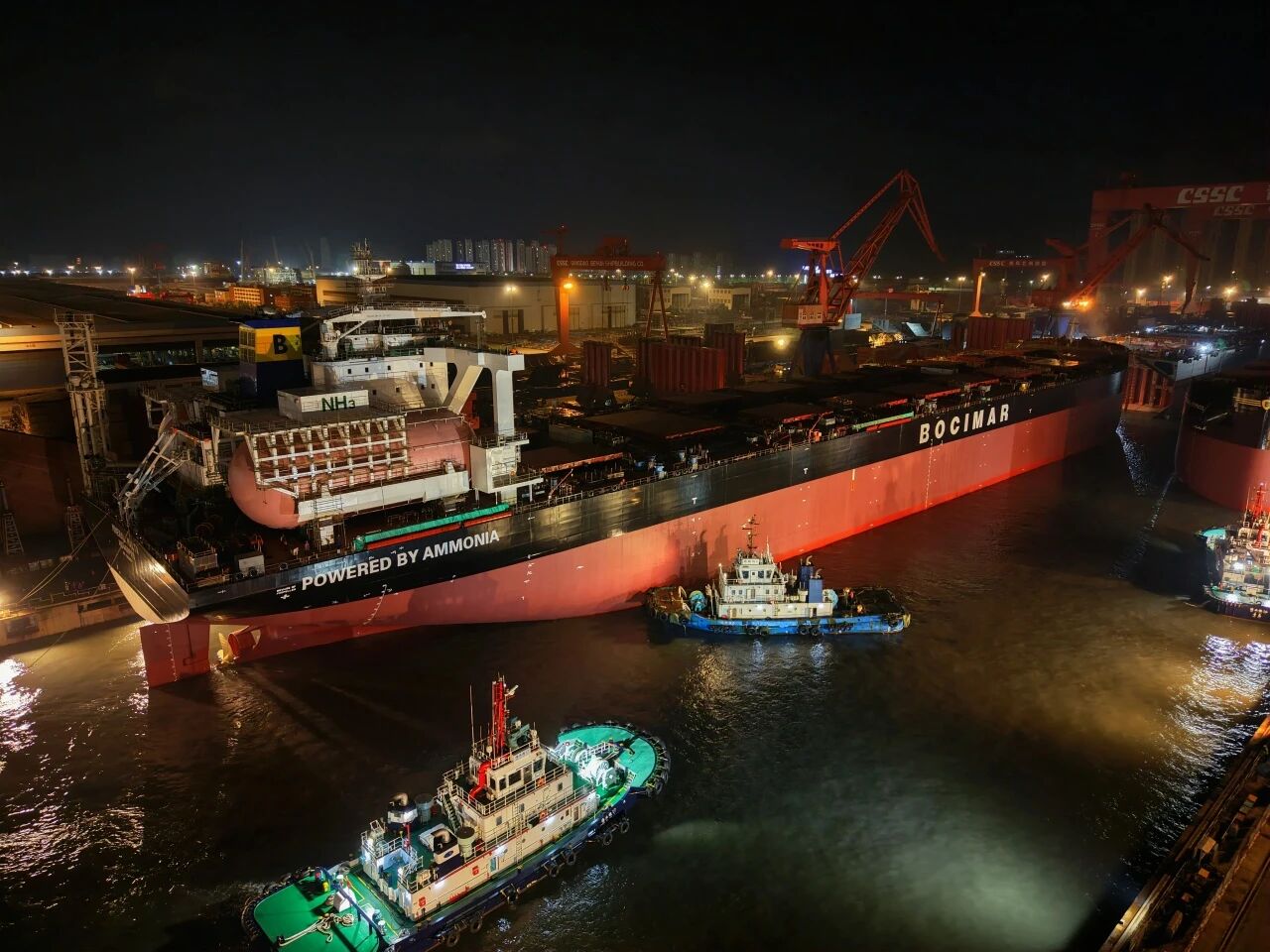 北海造船為比利時(shí)CMB.TECH公司建造的21萬(wàn)噸氨燃料動(dòng)力散貨船45號船和54號船順利出塢。