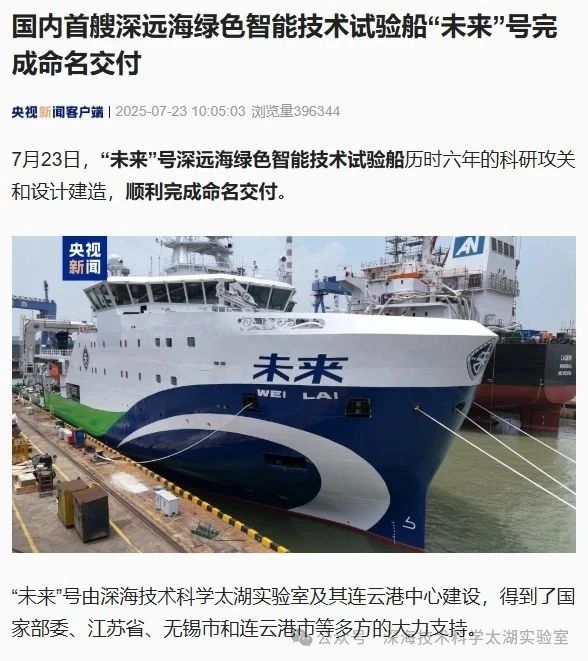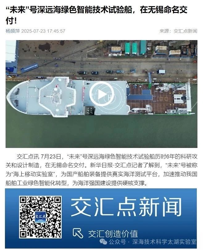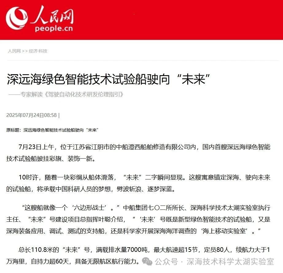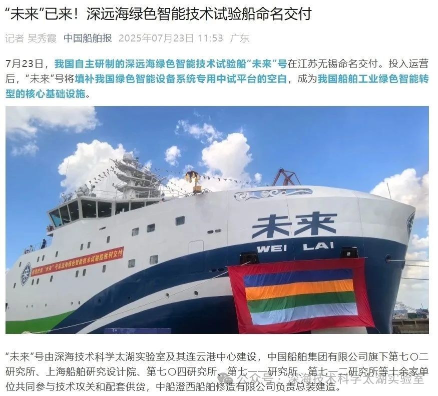 7月23日,由深海技術(shù)科學(xué)太湖實(shí)驗室歷時(shí)六年科研攻關(guān)和設計建造的“未來(lái)”號正式命名交付。中船集團旗下七〇二所、上船院、七〇四所、七一一所、七一二所等十余家單位共同參與技術(shù)攻關(guān)和配套供貨,中船澄西負責總裝建造人民日報、新華社、央視新聞、科技日報等主流媒體共同聚焦這一“國之重器”。