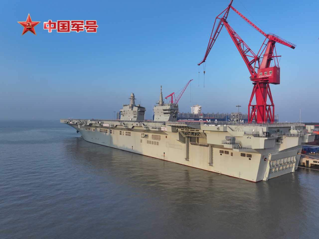在五艘拖船的牽引下,四川艦離開(kāi)滬東中華造船廠(chǎng)碼頭駛向相關(guān)海域。四川艦舷號為51,是海軍新一代兩棲攻擊艦,滿(mǎn)載排水量4萬(wàn)余噸,設置雙艦島式上層建筑和全縱通飛行甲板,創(chuàng )新應用電磁彈射和阻攔技術(shù),可搭載固定翼飛機、直升機、兩棲裝備等。
