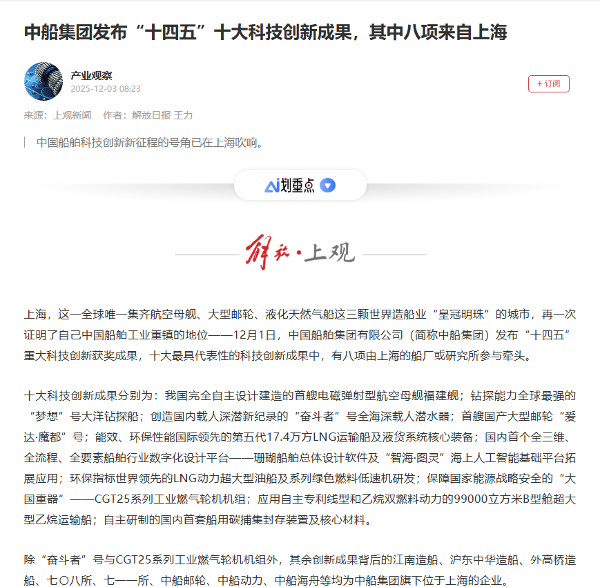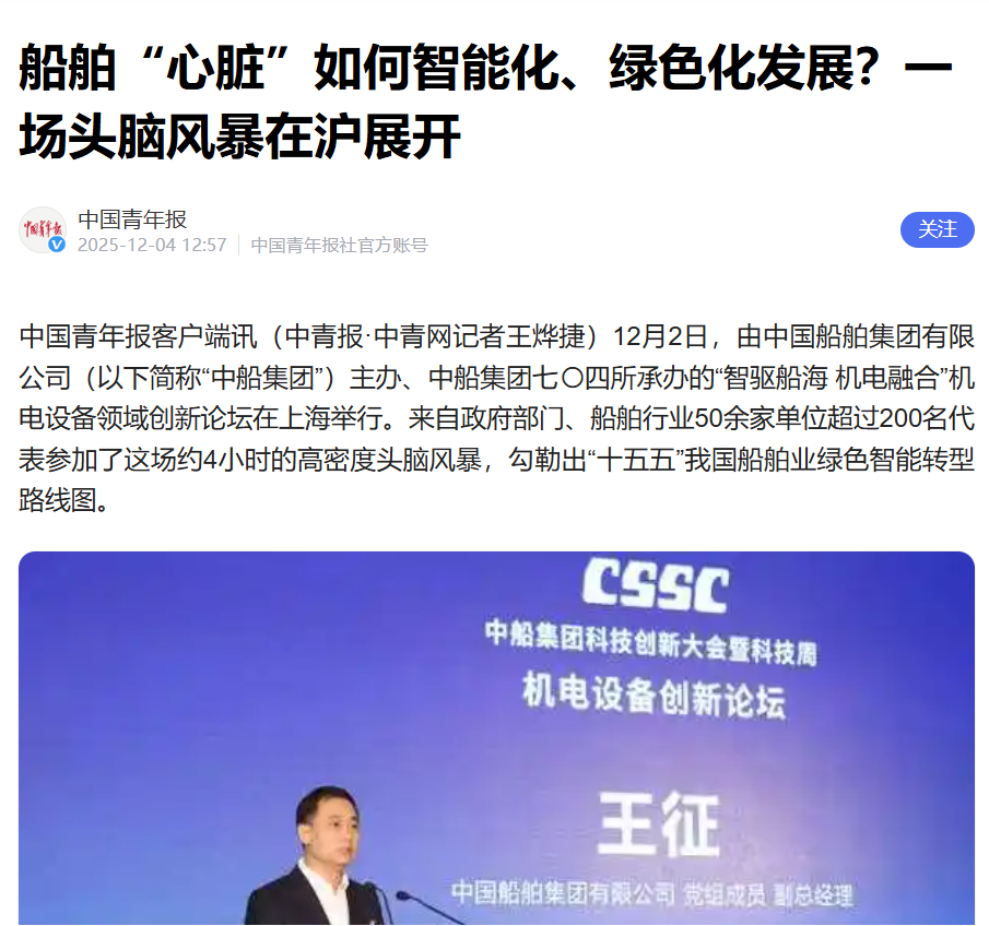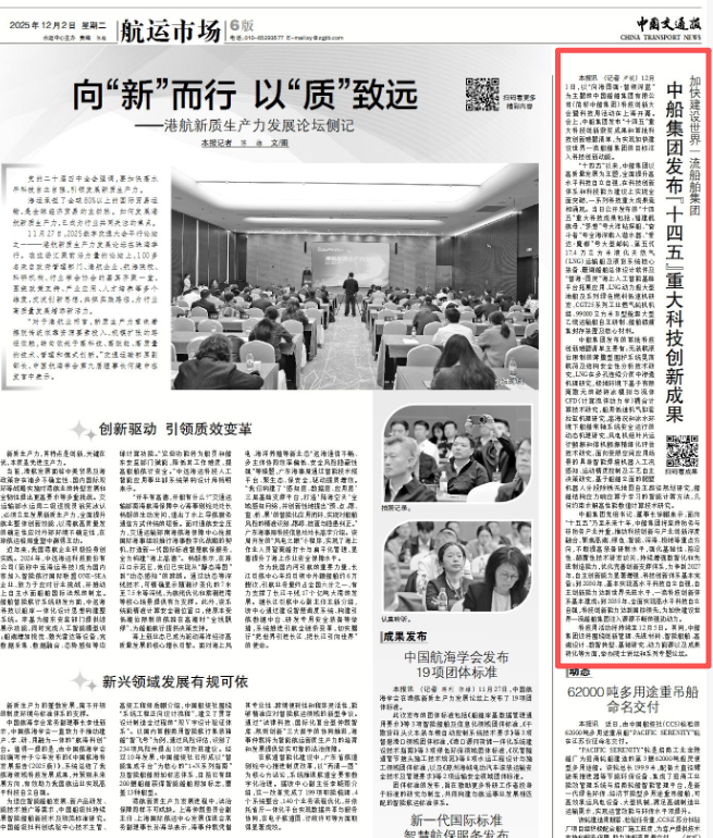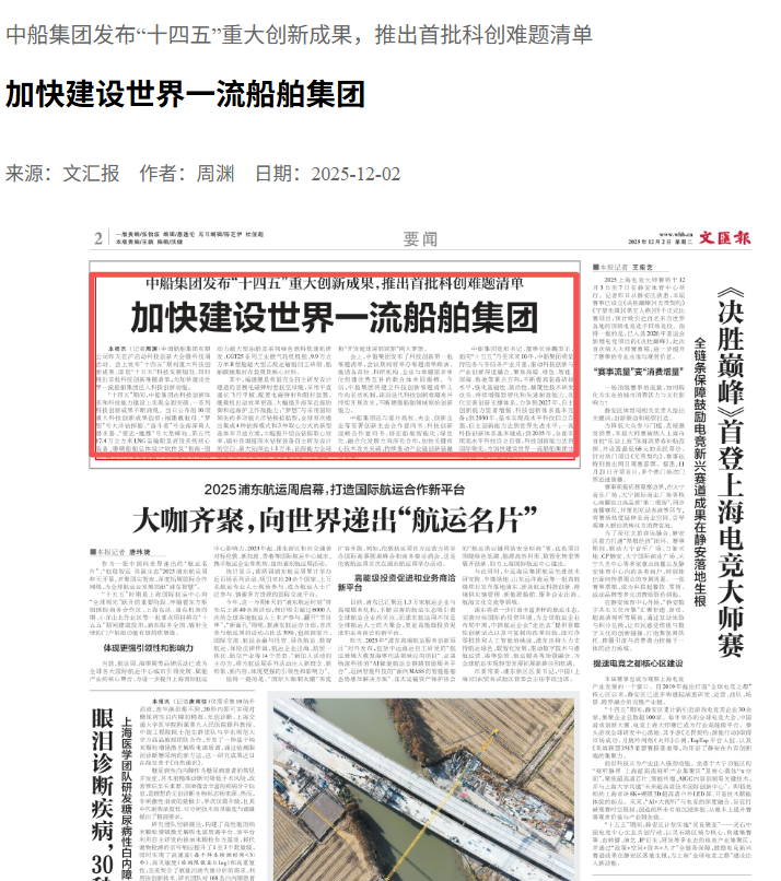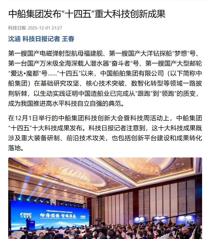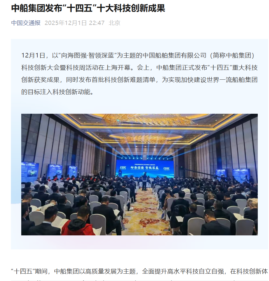 此次大會(huì )聚焦“向海圖強·智領(lǐng)深藍”主題,系統總結了中船集團“十四五”期間科技創(chuàng )新工作及重大科技創(chuàng )新成果,謀劃“十五五”科技發(fā)展規劃,引發(fā)中央、行業(yè)及地方媒體的廣泛關(guān)注報道。