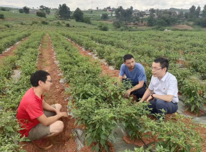 ▲洪術(shù)華(右一)在種植基地查看辣椒長(cháng)勢
